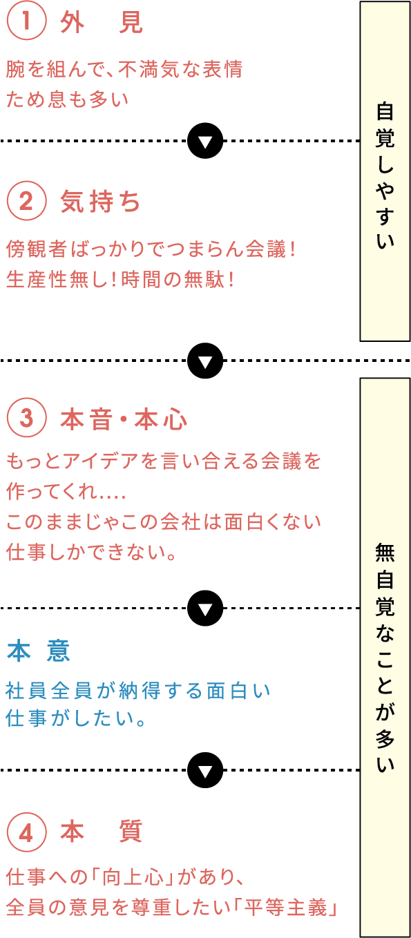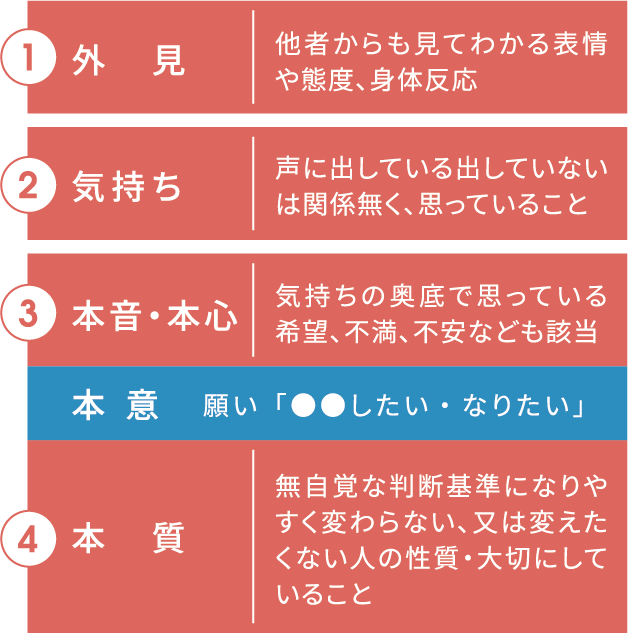 人を分解すると4層(+本意)になると定義します。自分を4層で考察できると他者を理解することができます。4層考察法による自己理解を図解します。